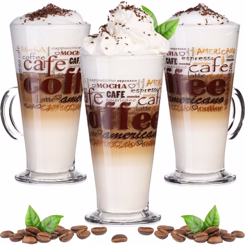 PLATINUX Kaffeegläser mit Motiv max. 280ml Set 3-Teilig aus Glas Latte Macchiato Gläser mit Griff Cappuccino Gläser